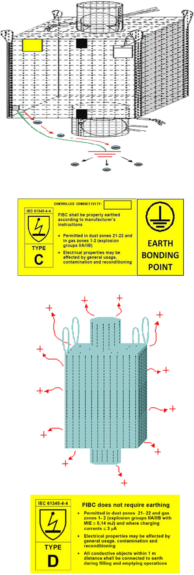 Type C型集装袋大多数是通过非导电聚丙烯纤维丝与导电丝交织而成, -般呈网格形状。导电丝的互联与接地是安全使用Type C型集装袋的关键所在。对于任何人工操作,应确保导电丝的通性以及正确接地,防止人为失误。